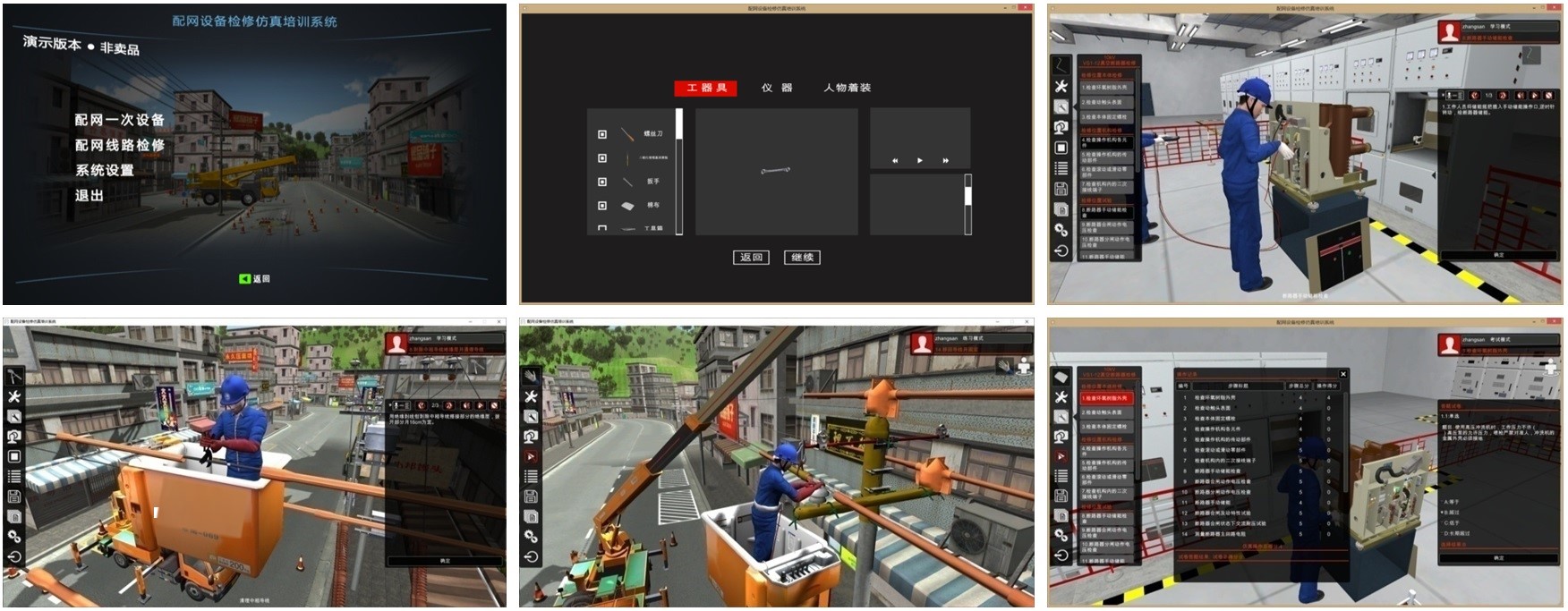 “配電網帶電作業仿真系統”通過三維虛擬仿真技術,將配網一次設備檢修、配電線路檢修過程中涉及的標準化作業流程、檢修工藝及危險點進行全方位、全角度、全細節的展示,實現配電網全過程仿真模擬,其業務模塊實現自我學習、模擬演練、在線考試、培訓工作管理等功能。